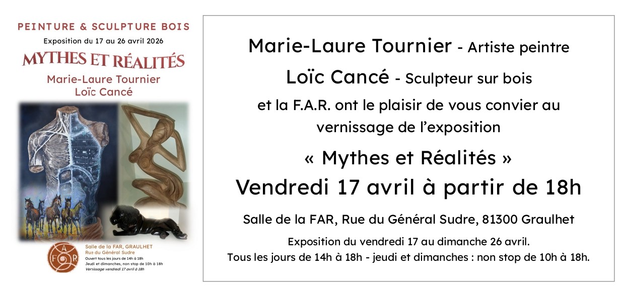 Vernissage de l'exposition Peintures et Sculpture bois vendredi 17 avril 2026 à partir de 18 heures.